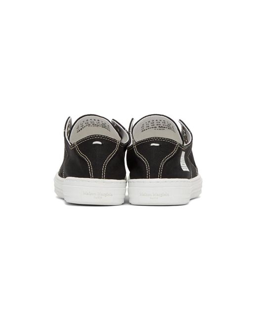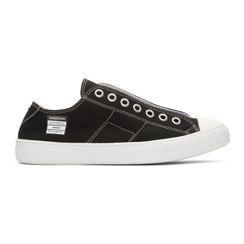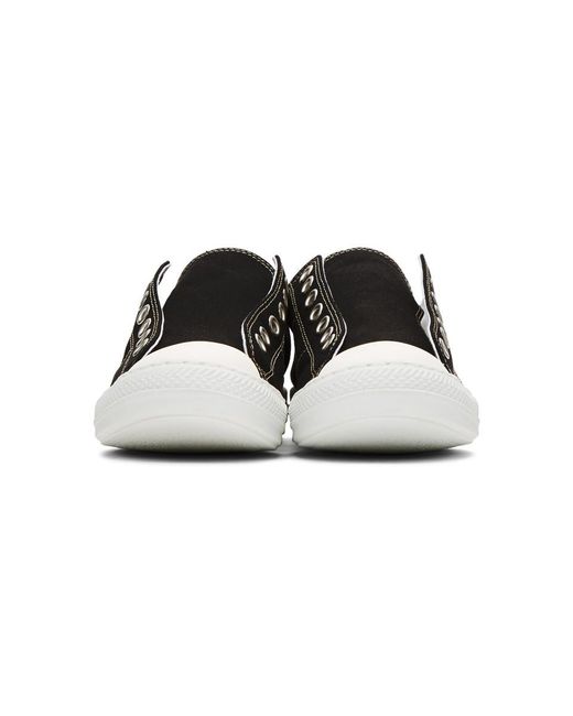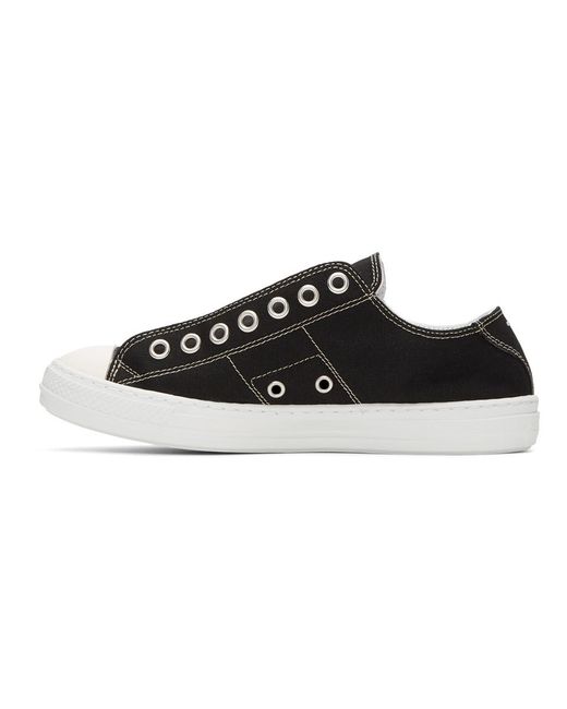 キャンバスのロートップ スニーカー。カラーはブラック。ホワイトのラバーのラウンド キャップ トゥ。アイロウにアイレットのディテール。タンの両側に伸縮性のあるガセット。ヒール カラーにシグネチャのホワイトのステッチ。ホワイトのトレッド ラバー ソール。シルバートーンのハードウェア。サプライヤー カラー:Black