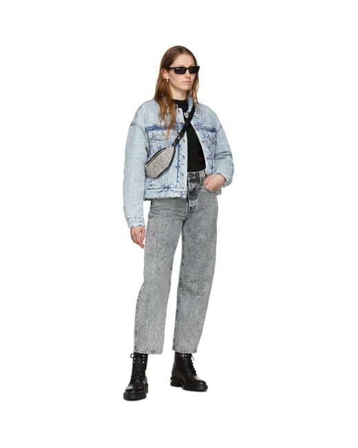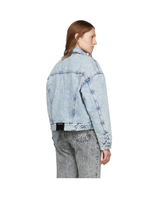 ノンストレッチ デニムのパッド入り長袖デニム ジャケット。カラーはブルー。 ・スプレッド カラー ・胸にフラップ ポケット ・ウエストにウェルト ポケット ・シングルボタンのバレル カフス ・背面の裾に調節ができるボタン留めのタブとレザーのロゴ パッチ ・ブラックのロゴを織り込んだサテンの裏地 ・ロゴを刻印したシルバートーンのハードウェア ・イエローのコントラスト ステッチ サプライヤー カラー: Pebble blue